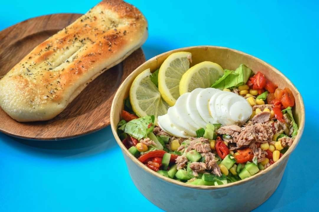 סלט טונה (עגבניה, מלפפון, חסה, בצל, ביצה קשה, תירס, מלפפון חמוץ וטונה)- 45 ₪